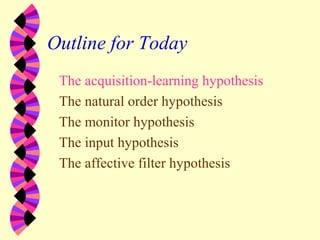 1. The Acquisition-Learning Hypothesis distinguishes between subconscious acquisition and conscious learning, positing that acquisition is more important and is facilitated by comprehensible input.
