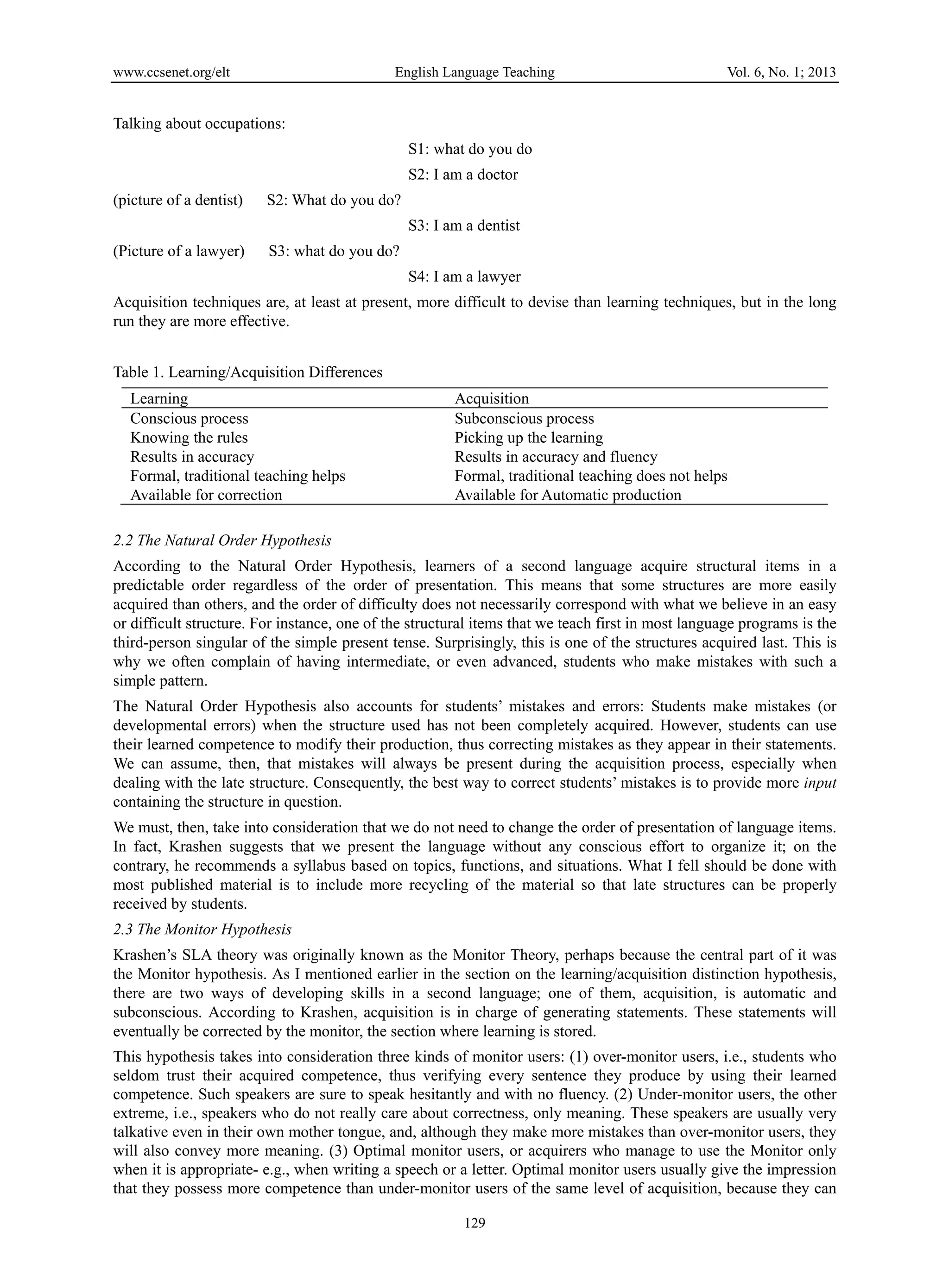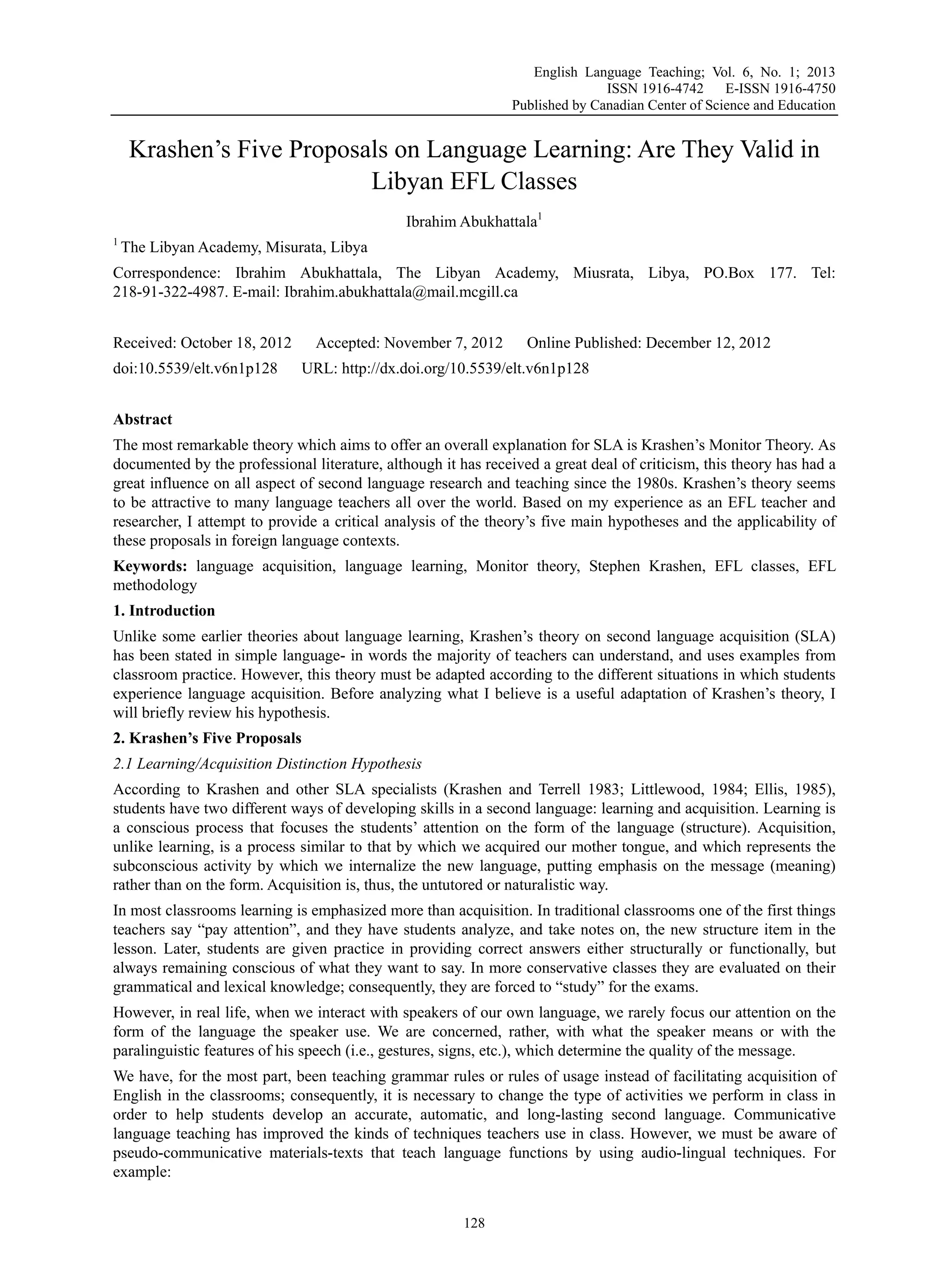 The document discusses Krashen's five proposals on language learning and their validity in Libyan EFL classes. It summarizes Krashen's proposals which include: 1) the distinction between language learning and acquisition, 2) the natural order hypothesis which states that language structures are acquired in a predictable order, 3) the monitor hypothesis which describes three types of language users, 4) the input hypothesis which argues that language is acquired through comprehensible input, and 5) the affective filter hypothesis which posits that learners with high motivation and self-confidence acquire language more readily. The document analyzes how these proposals can be adapted to better suit foreign language learning contexts.