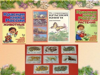 Документ описывает Красную книгу, содержащую списки редких и находящихся под угрозой исчезновения видов животных и растений, созданную в СССР в 1974 году и продолжающую публиковаться по сей день. В нем приводятся различные виды, находящиеся под охраной, а также меры по их сохранению и описание природоохранных учреждений, таких как заповедники и национальные парки. Также упоминается о важности защиты природы и ее биоразнообразия.