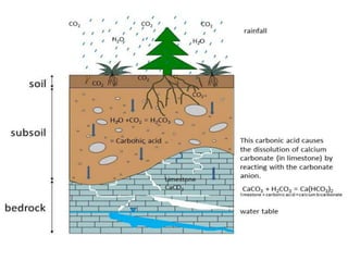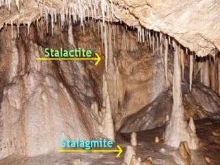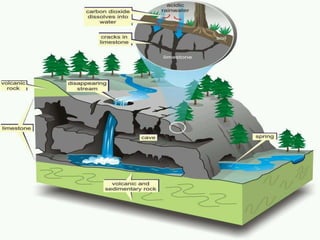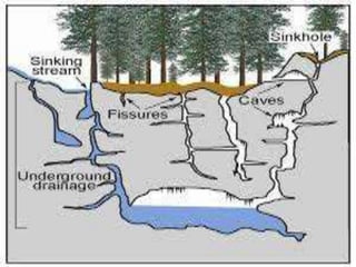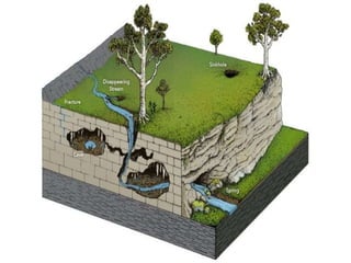 Karst topography is formed by the dissolution of soluble rocks like limestone by surface water and groundwater. Key conditions for karst topography include thick soluble rock near the surface, fractures in the rock, and moderate rainfall. Rainwater picks up carbon dioxide to form weak carbonic acid, which dissolves cracks in the limestone over time, enlarging fractures and creating underground drainage systems. Common surface features of karst terrain include sinkholes, springs, dry valleys, and disappearing streams. Subsurface features include caves, underground streams, stalactites that grow downward from cave ceilings, and stalagmites that form on cave floors.