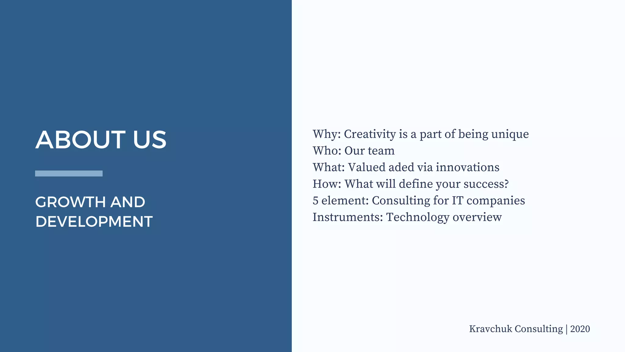 Kravchuk Consulting specializes in innovative business transformation by integrating technology and creativity to enhance client success. Their services encompass consulting for IT companies, digital transformation management, and the application of immersive technologies and robotic process automation. With a focus on both human and digital elements, they aim to improve operational efficiency and client engagement.