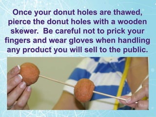 1) Pierce thawed donut holes with skewers, leaving space at the top and bottom, and trim any sharp ends.