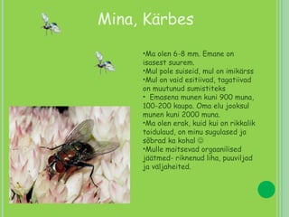 Mina, Kärbes Maolen 6-8 mm. Emane on isasest suurem. Mul pole suiseid, mul on imikärss Mul on vaid esitiivad, tagatiivad on muutunud sumistiteks Emasena munen kuni 900 muna, 100-200 kaupa. Oma elu jooksul munen kuni 2000 muna. Ma olen erak, kuid kui on rikkalik toidulaud, on minu sugulased ja sõbrad ka kohal Mulle maitsevad orgaanilised jäätmed- riknenud liha, puuviljad ja väljaheited.