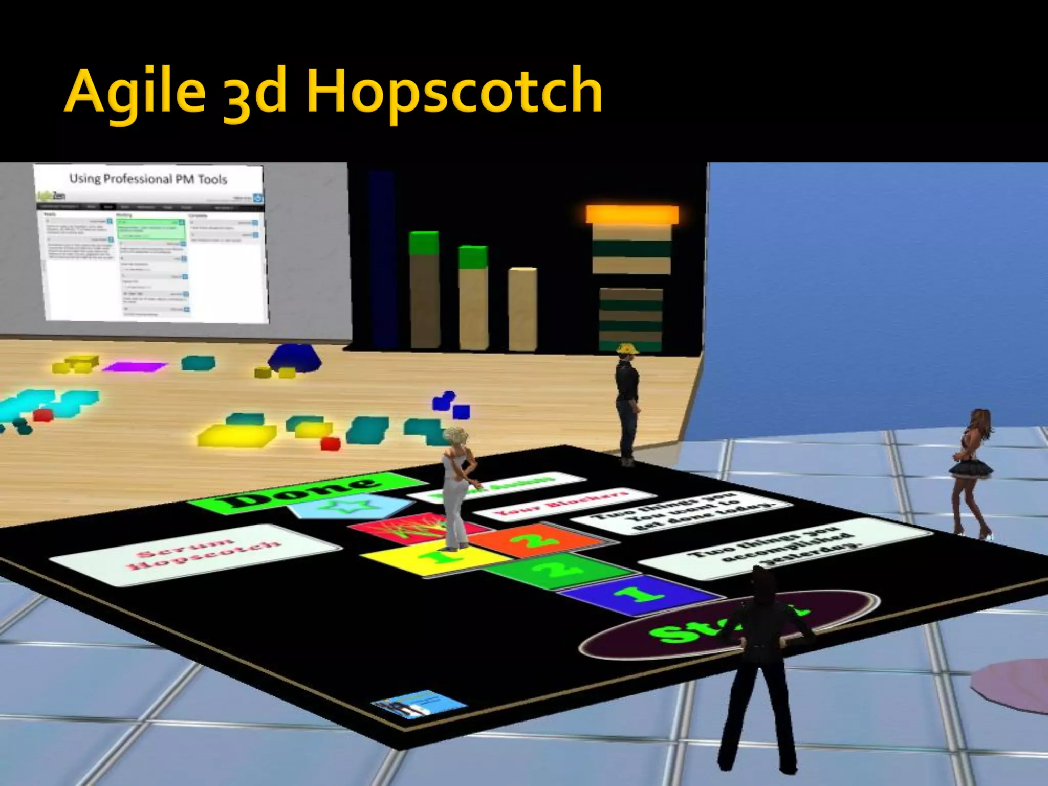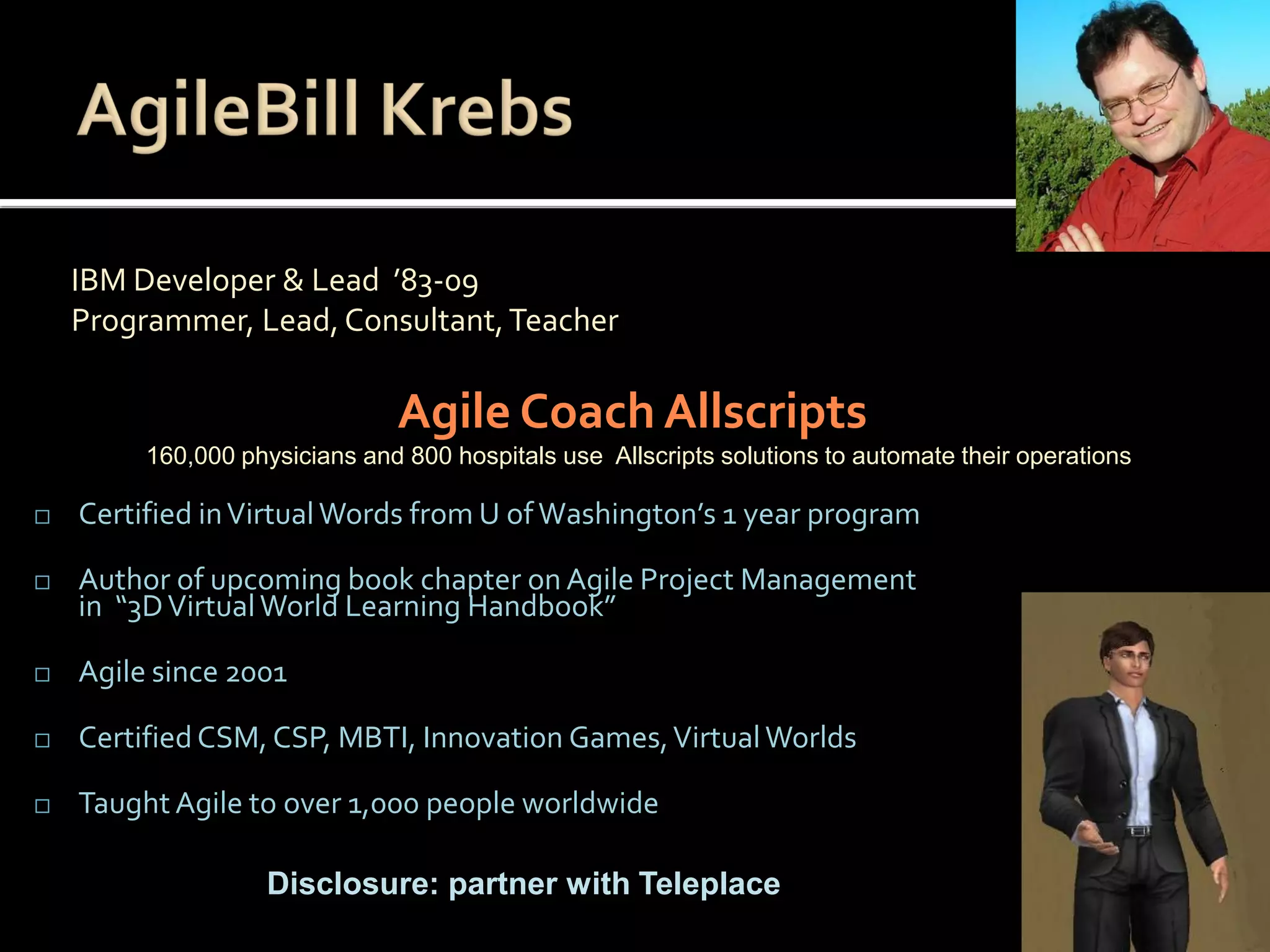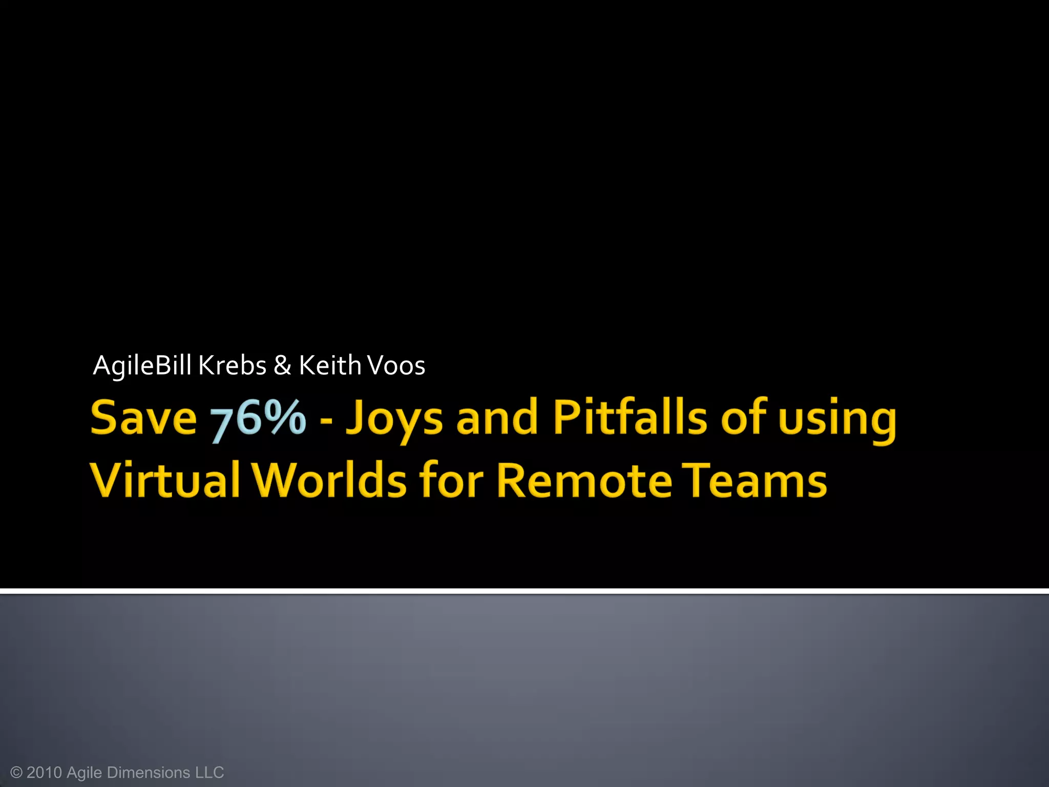 The document discusses the use of virtual worlds in agile project management and collaboration, highlighting various tools and techniques that enhance communication among dispersed teams. It outlines the benefits of virtual environments, including cost savings and improved engagement, while also mentioning challenges such as technological learning curves and issues with sound quality. Several case studies are presented, showcasing successful implementations in diverse settings, including corporate meetings and educational training.