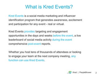 Kred Events is a social media marketing and influencer identification program that uses real-time leaderboards and analytics to generate awareness, excitement, and participation for events. It tracks influence and outreach on social media before, during, and after events to help event planners identify influencers, see what content and speakers are most popular, and gain feedback and connections between attendees. Case studies show how branded leaderboards at events brought communities together and helped people discover shared interests.