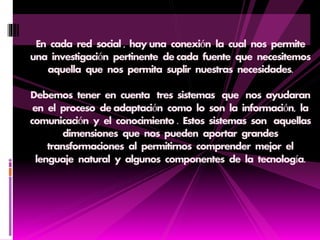 El documento describe cómo la tecnología y las redes sociales han transformado la sociedad y la cultura actual. Señala que debemos adaptarnos a este nuevo mundo digital mediante el uso responsable de la cibercultura y la información, comunicación y conocimiento que proveen sistemas como Internet. También advierte sobre los riesgos de exponer nuestra identidad en línea y la importancia de disfrutar la tecnología de manera segura y con moderación.