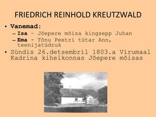 FRIEDRICH REINHOLD KREUTZWALDVane m ad : Isa – J õ epere mõisa kingsepp Juhan Ema - T õ nu Peetri t ü tar Ann, teenijat ü druk Sündis 26.detsembril 1803.a Virumaal Kadrina kihelkonnas J õ epere m õ isas