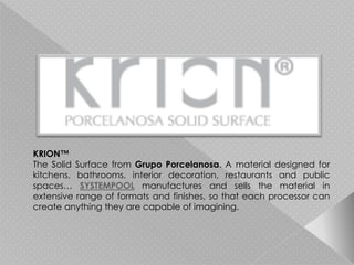 KRION is a solid surface material composed of two-thirds natural minerals and resins. It is durable, resistant to chemicals and impacts, anti-bacterial, thermoformable, and available in 83 colors. KRION does not absorb liquids, making it easy to clean and maintain. It has a 10-year guarantee and can be used for kitchen and bathroom countertops, furniture, interior and exterior architectural applications. KRION has a variety of certifications for safety, sustainability and recycled content. Several high-end commercial and residential projects around the world have used KRION.