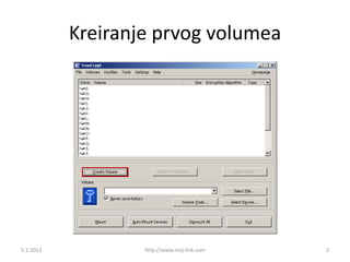 Dokument opisuje postupak kriptiranja podataka na računalu korištenjem aplikacije TrueCrypt. Korisnici mogu stvoriti kriptirani volumen, odabrati tip i veličinu, zaštititi ga lozinkom te montirati volumen na virtualni disk. Nakon završetka, podaci su zaštićeni unutar volumena koji se može dismountati.
