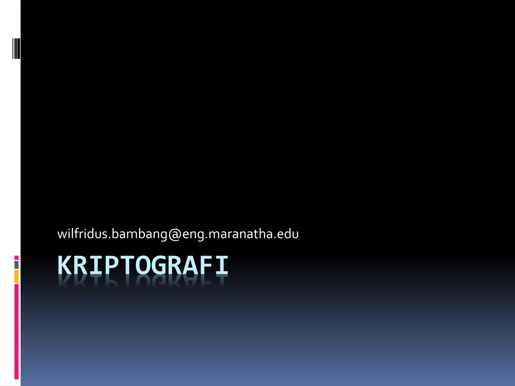 Dokumen tersebut membahas tentang kriptografi secara singkat dalam 3 kalimat. Pertama, kriptografi adalah ilmu dan teknik untuk menjaga kerahasiaan data digital dengan mengenkripsinya. Kedua, terdapat beberapa algoritma kriptografi seperti simetris dan asimetris. Ketiga, sejarah kriptografi dimulai sejak zaman Mesir Kuno hingga Perang Dunia II.