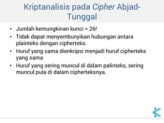 Dokumen tersebut membahas tentang kriptanalisis cipher abjad-tunggal, yaitu metode dekripsi tanpa mengetahui kunci dengan menganalisis frekuensi huruf dan menerka pola. Terdapat dua metode utama, yakni analisis frekuensi huruf dan menerka berdasarkan konteks atau pengetahuan bahasa yang digunakan.