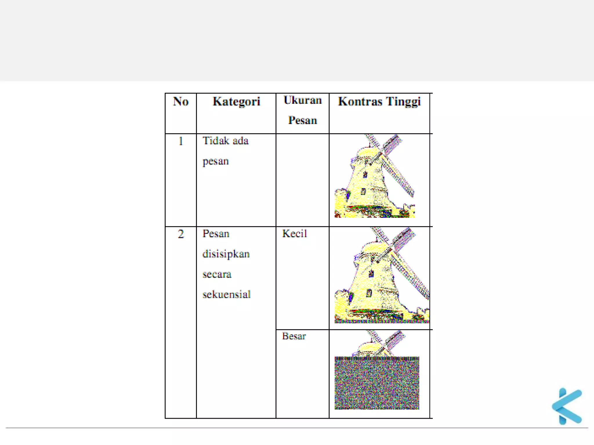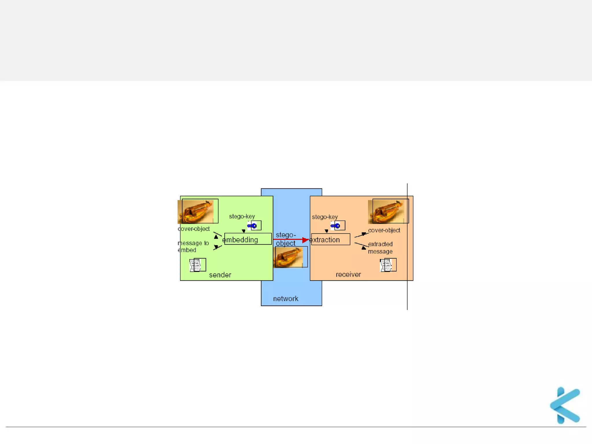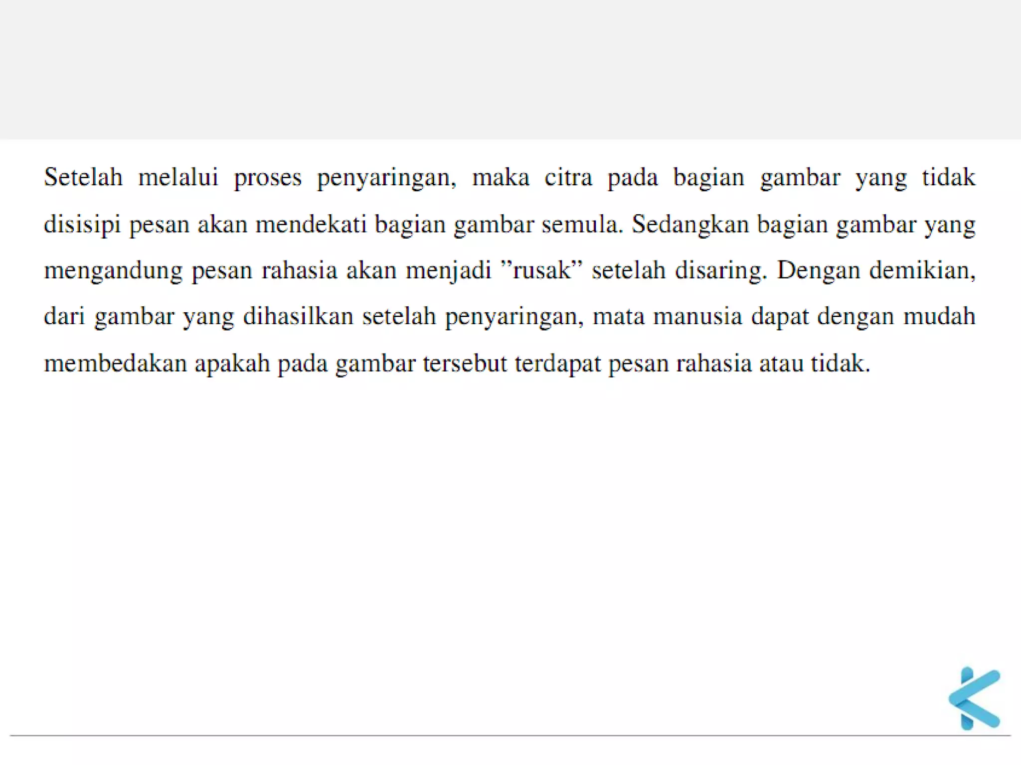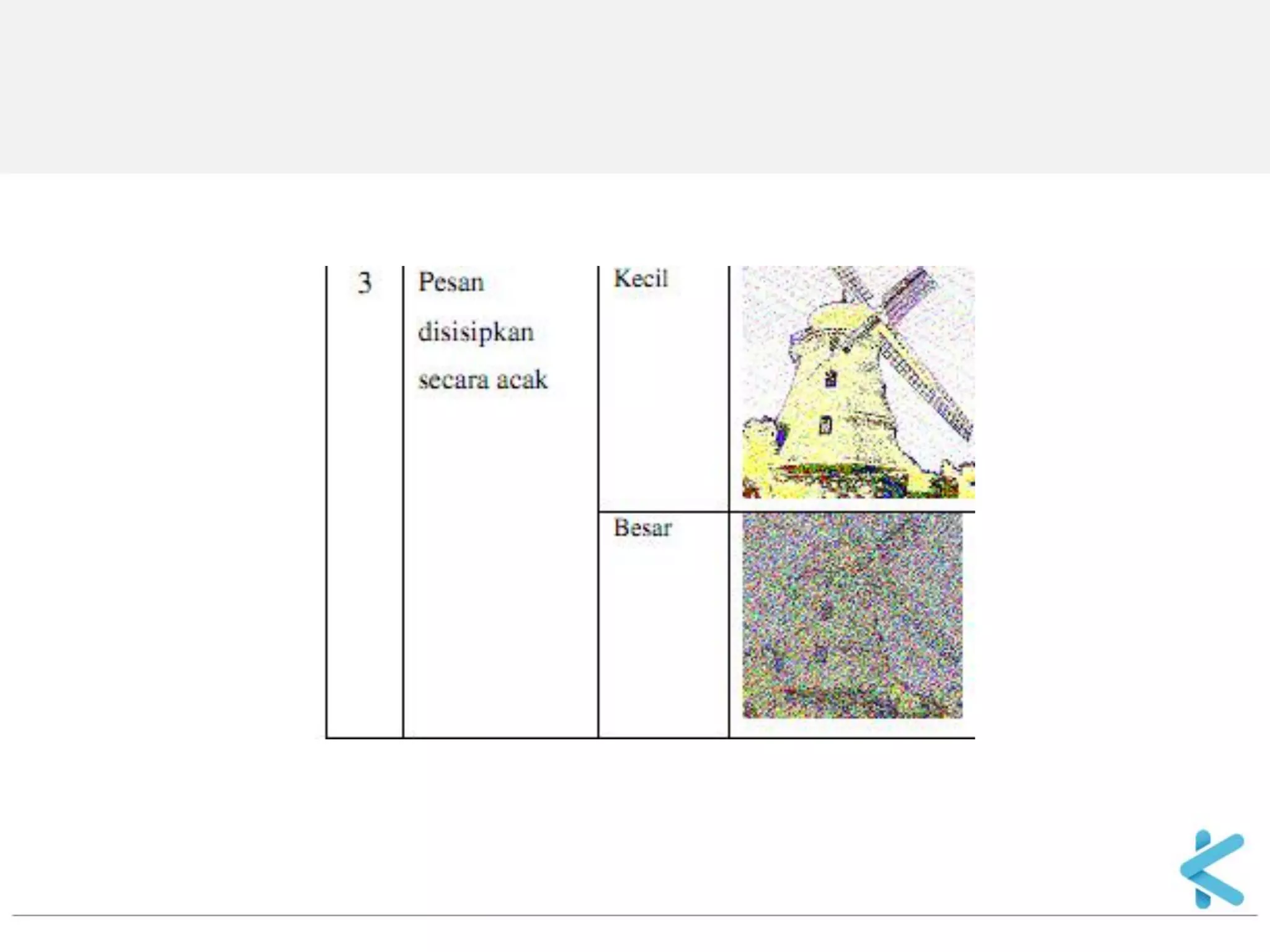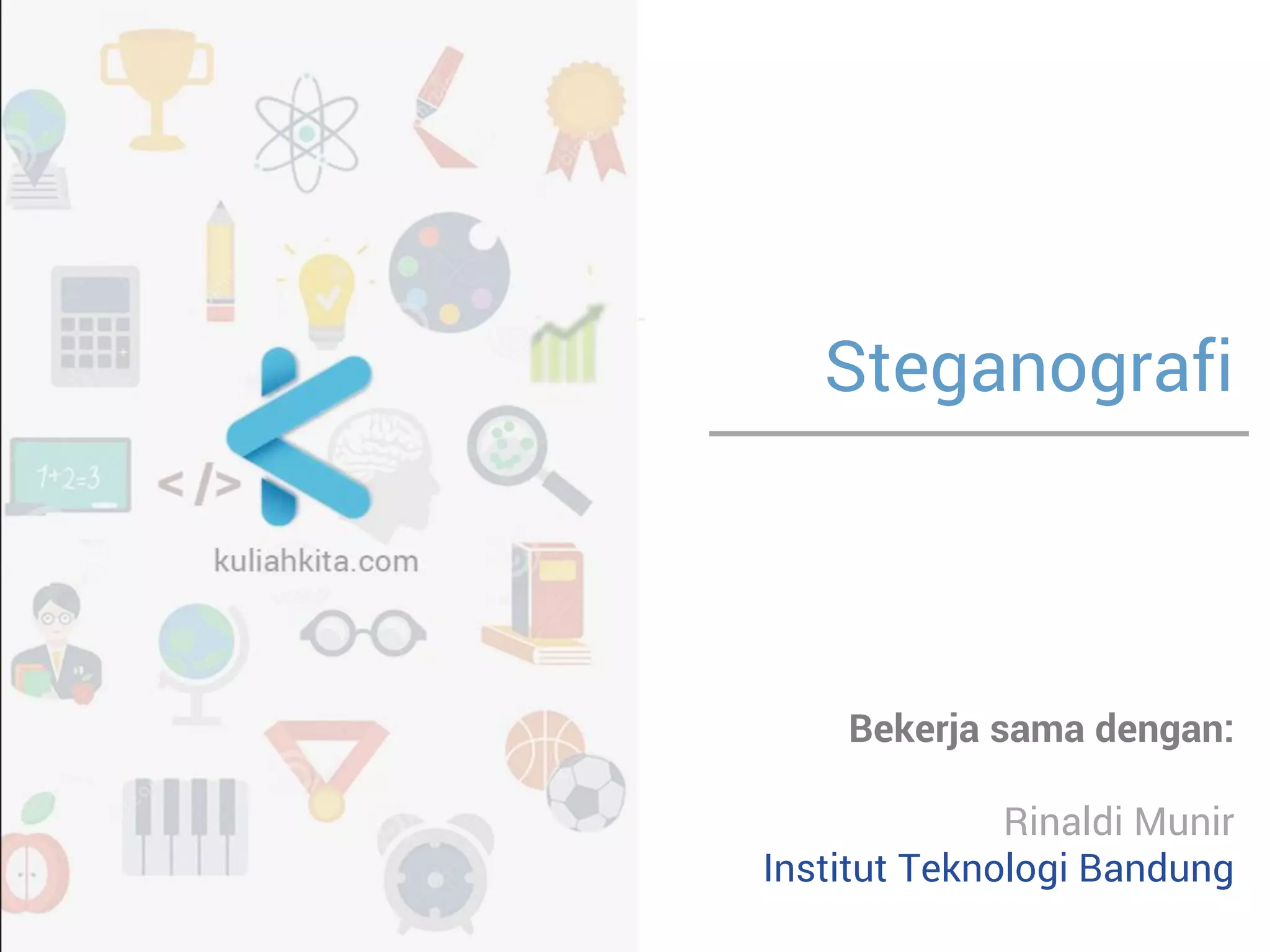 Steganografi adalah ilmu dan seni menyembunyikan informasi dengan menyisipkan pesan rahasia di dalam pesan lain seperti gambar, audio, atau teks. Teknik ini berguna untuk mengirim pesan secara rahasia tanpa diketahui orang lain. Metode penyisipan pesan pada gambar digital yang umum adalah dengan mengganti bit terakhir dari setiap piksel (LSB substitution) karena perubahan ini sulit dideteksi oleh mata manusia.