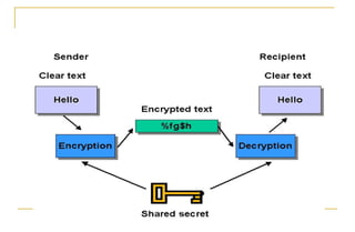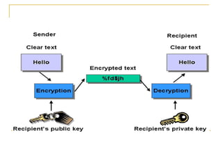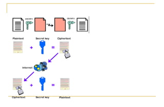 Dokumen ini membahas konsep dasar kriptografi, termasuk enkripsi dan dekripsi, serta berbagai teknik seperti substitusi, blocking, permutasi, ekspansi, dan pemampatan. Kriptografi melibatkan penggunaan kunci untuk mengamankan pesan, dengan dua jenis algoritma yaitu simetris dan asimetris. Beberapa metode yang dijelaskan termasuk Caesar cipher dan RSA, yang digunakan untuk menjaga keamanan data.