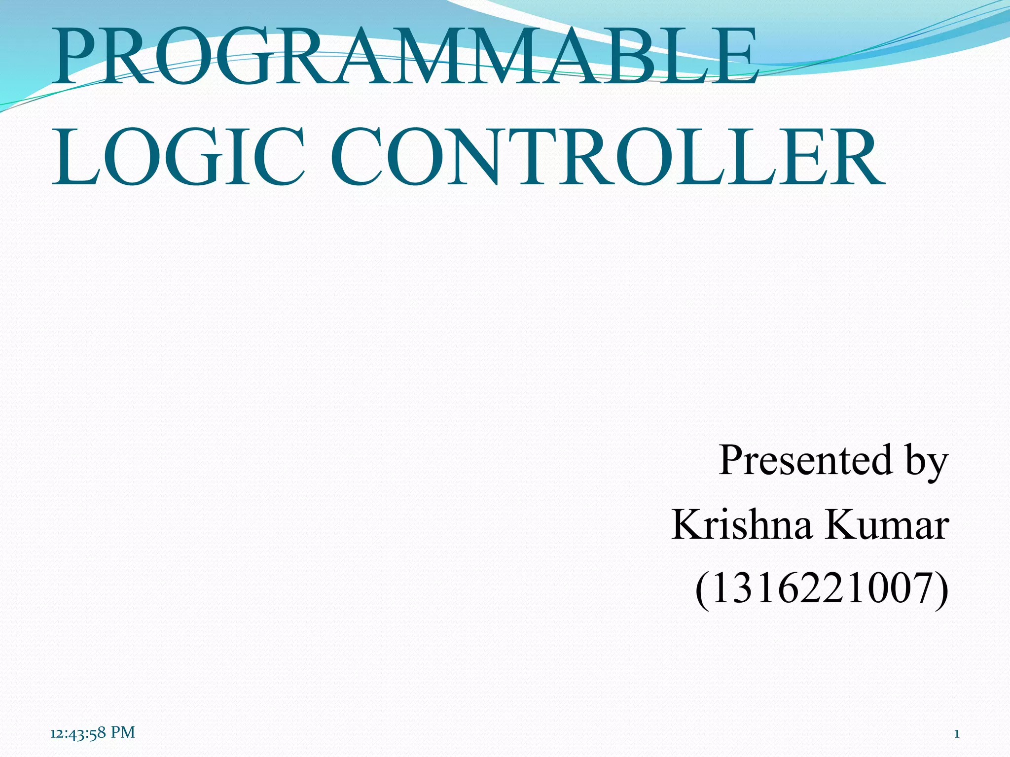The document discusses programmable logic controllers (PLCs). It provides a definition of a PLC as a digital computer designed for industrial control applications. The document outlines the history of PLCs, which were introduced in the 1960s to replace relay-based controls. It describes the major components of a common PLC, including a processor, power supply, input/output modules, and a programming device. The document discusses ladder logic as a common PLC programming language and provides an example ladder logic diagram for starting and stopping a motor. It also lists some advantages of PLCs like reliability, flexibility, and cost-effectiveness, as well as some disadvantages such as proprietary components. Applications of PLCs include robotics
