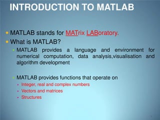 MATLAB is a matrix laboratory software package for numerical computation and visualization. It provides functions and tools for matrix manipulation, plotting and visualization, implementation of algorithms, data analysis, and numerical solution of problems. MATLAB has a programming language and interactive environment for algorithm development, data visualization, data analysis and numeric computation. It supports matrix and array operations, plotting of functions and data, implementation of algorithms, creation of user interfaces, and interfacing with programs written in other languages.