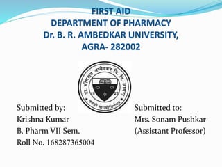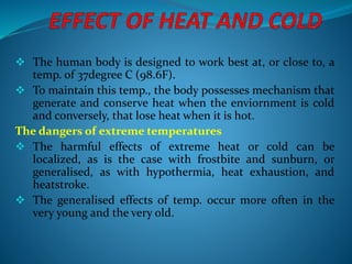 This document provides information on first aid for various medical issues related to temperature extremes, foreign bodies, poisoning, bites, and stings. It discusses the body's normal temperature range and mechanisms for regulating temperature. Extreme temperatures can cause localized issues like frostbite or sunburn, or generalized issues like hypothermia or heatstroke. First aid for these conditions involves removing the casualty from the dangerous environment and restoring normal body temperature. The document also outlines first aid procedures for foreign bodies, household and drug poisonings, industrial hazards, food poisoning, and animal bites.