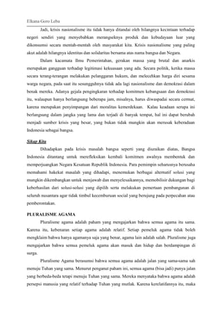 Krisis nasionalisme dan pluralisme agama merupakan isu penting di Indonesia. Krisis nasionalisme ditandai dengan hilangnya rasa kebangsaan dan solidaritas, serta munculnya konflik berbasis suku, agama, dan ideologi. Pluralisme agama menimbulkan konflik ketika satu agama bersikap fanatik tanpa menghargai agama lain. Upaya pemecahan masalah ini adalah dengan kembali ke semangat Bhinneka Tunggal Ika dan mengamalk