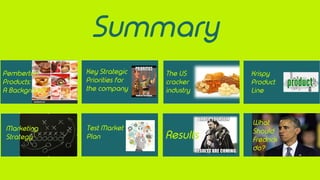 Krispy Natural is a cracker brand that was relaunched by Pemberton Beverage Division with improved taste, quality, and packaging. Market testing in two regions showed strong initial sales and share increases, though competitive response was a concern. While large retailers and buyers responded positively, some analysts questioned the sustainability of promotional discounts. Moving forward, the strategy is to position Krispy Natural as a premium, healthier cracker and use comparative advertising to differentiate it in competitive markets. If Frito Lay enters the category, Pemberton will emphasize Krispy Natural's natural ingredients and premium positioning to avoid direct competition.