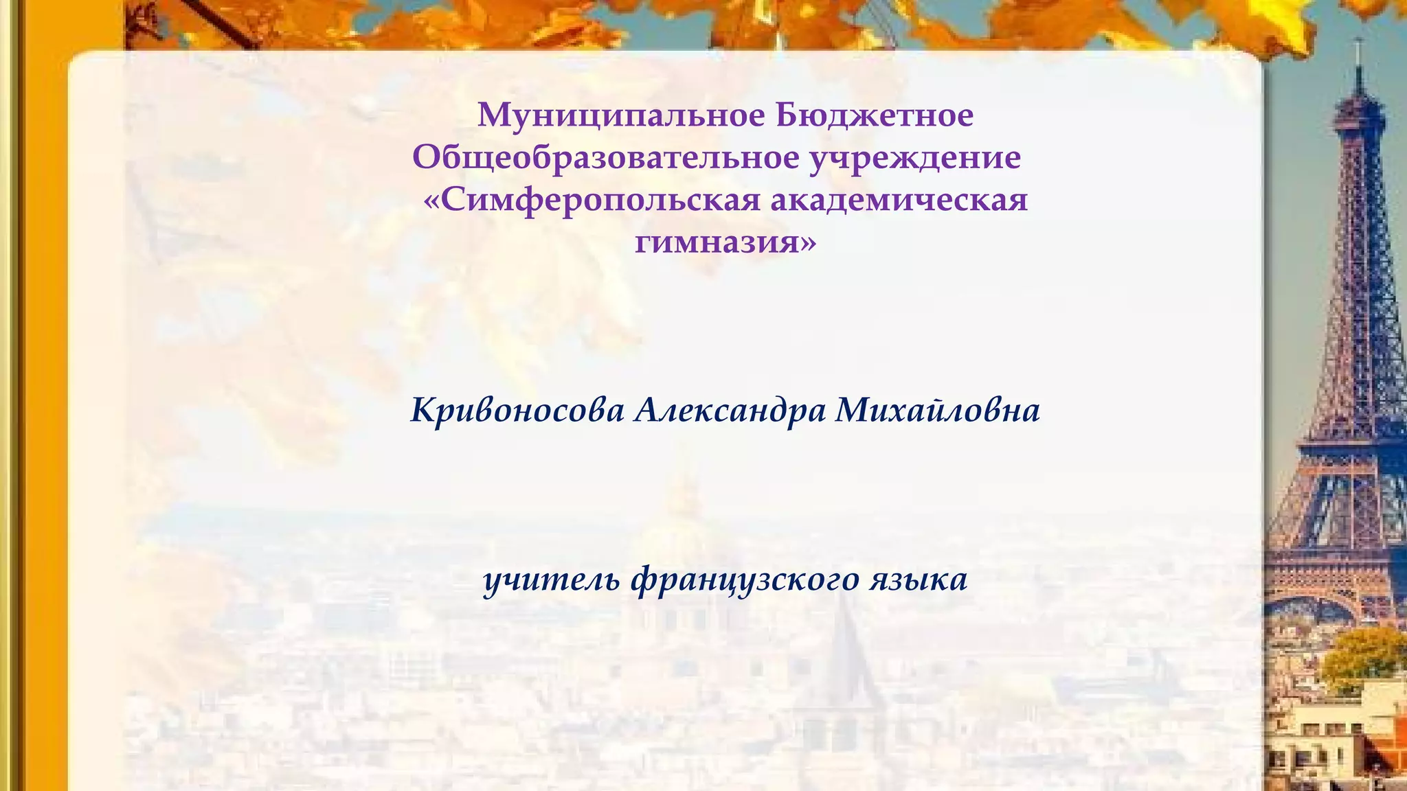 Кривоносовa Александра Михайловна является учителем французского языка в муниципальном бюджетном общеобразовательном учреждении «симферопольская академическая гимназия», с педагогическим стажем 7 лет. Она получила высшее образование в ТНУ им. В.И. Вернадского и прошла курсы повышения квалификации в 2014 году. Александра активно участвует в мероприятиях, включая региональный этап Всероссийской олимпиады и семинары по реализации ФГОС.