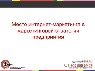 Документ обсуждает важность интернет-маркетинга в условиях глобального кризиса, подчеркивая необходимость конверсии и различных стратегий продвижения и анализа производительности. Он представляет тренды рунета 2012 года, включая рост аудитории и увеличение мобильного доступа, а такжекакие важные аспекты нужно учитывать при создании и продвижении веб-сайта. Также рассматриваются инструменты интернет-маркетинга и цели, которые бизнес должен ставить для эффективной работы в сети.