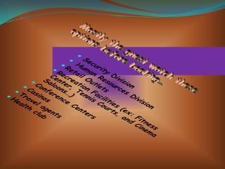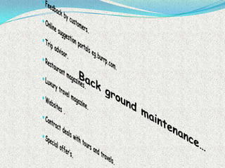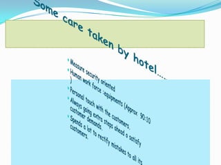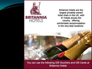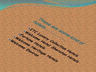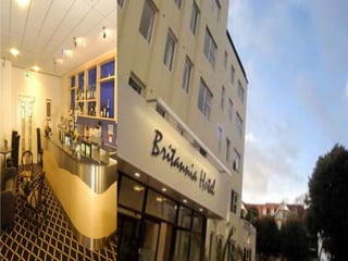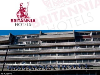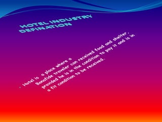 The hotel industry originated in the 6th century BC. The earliest inns were basic halls where travelers slept alongside the animals they traveled with. Over hundreds of years, as travel changed, hotels developed into various classifications by market segment, room size, level of service, ownership, and star ratings. ITC hotels own and operate over 100 hotels across India, including landmark properties like the ITC Maurya in Delhi. They offer a variety of services and facilities and use a 7P marketing approach. Britannia hotels operate over 40 hotels across the UK, growing from a single acquisition in 1976, and offer conference and event facilities for up to 4,000 delegates.