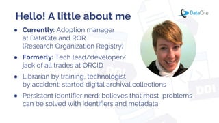 The document discusses the importance of persistent identifiers (PIDs) in enhancing the visibility and value of humanities research outputs, particularly monographs. It emphasizes how PIDs like DOIs, ORCID IDs, and ROR IDs facilitate discovery, citation, and integration across digital scholarly infrastructures. Additionally, it provides actionable steps for scholars and organizations to leverage PIDs effectively in their workflows and publication processes.