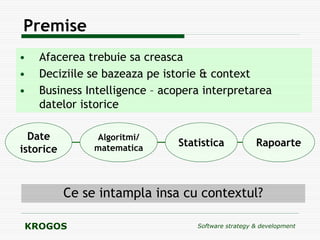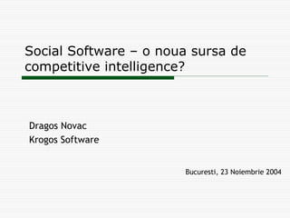 Documentul discută despre utilizarea software-ului social ca sursă de inteligență competitivă, subliniind importanța contextului în luarea deciziilor strategice. Se evidențiază rolul weblogurilor și al altor platforme de socializare în îmbunătățirea comunicării și colectării informațiilor relevante pentru business. De asemenea, se sugerează că sistemele de business intelligence tradiționale sunt insuficiente fără integrarea unor perspective sociale actualizate.
