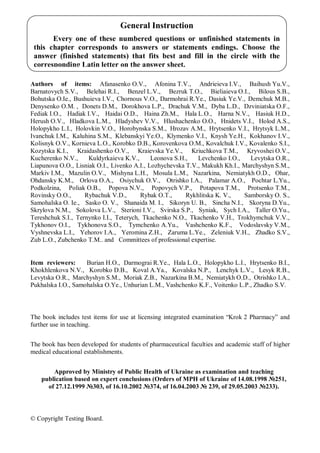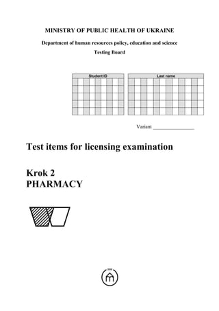 This document contains test items for the licensing examination "Krok 2 Pharmacy" for Russian-speaking students in Ukraine. It lists over 200 authors and item reviewers who developed the test questions covering various topics in pharmacy. The test is intended for pharmacy students and faculty and has been approved by the Ministry of Public Health of Ukraine for use in examinations and teaching since 1998.