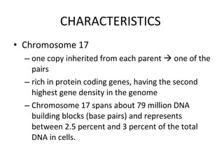 Chromosome 17 and 18 each contain around 1,200-1,500 genes. Chromosome 17 is associated with conditions like acute promyelocytic leukemia and neurofibromatosis type 1. Chromosome 18 is associated with conditions such as Niemann-Pick disease, Pitt-Hopkins syndrome, and osteopetrosis. Pitt-Hopkins syndrome is caused by mutations in the TCF4 gene on chromosome 18 and is characterized by developmental and facial abnormalities.