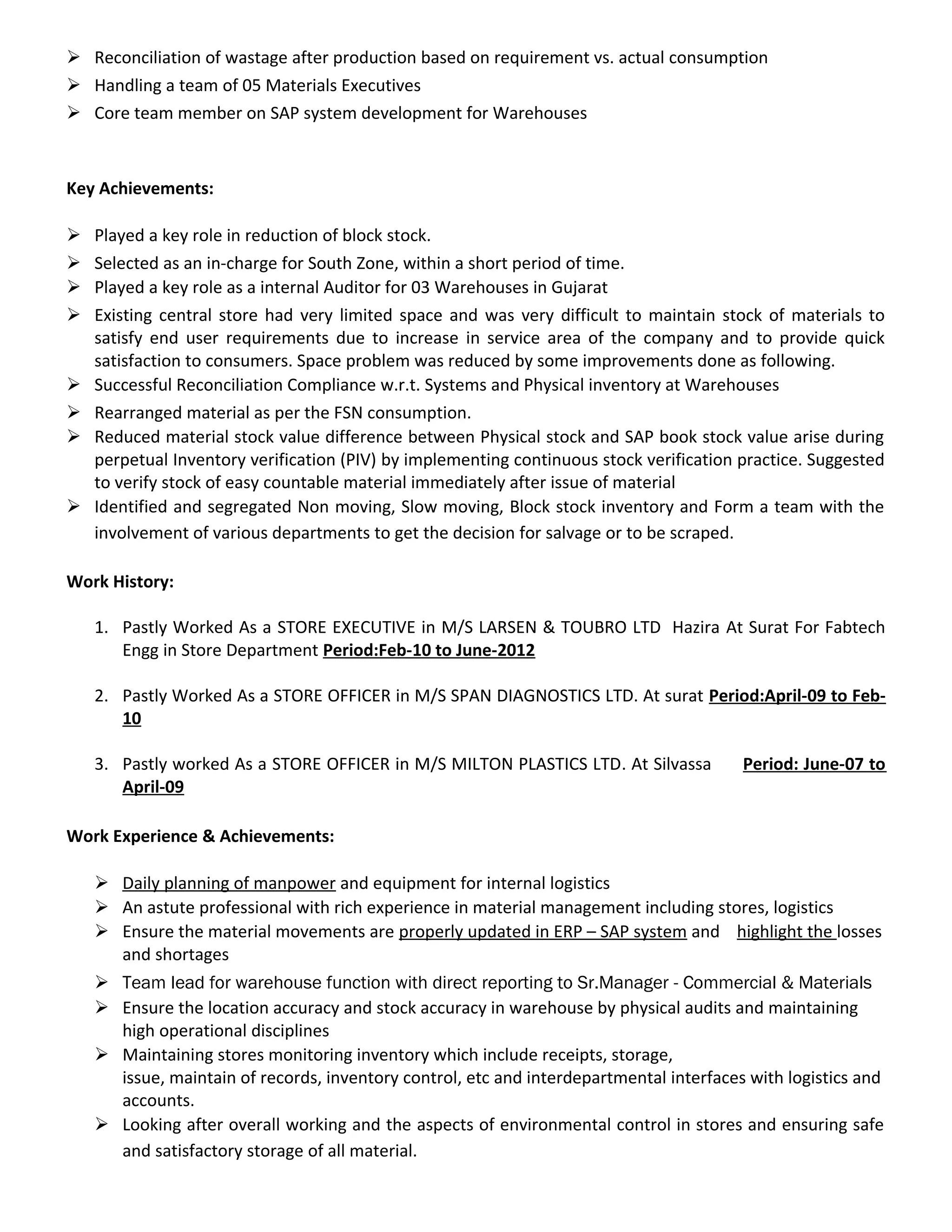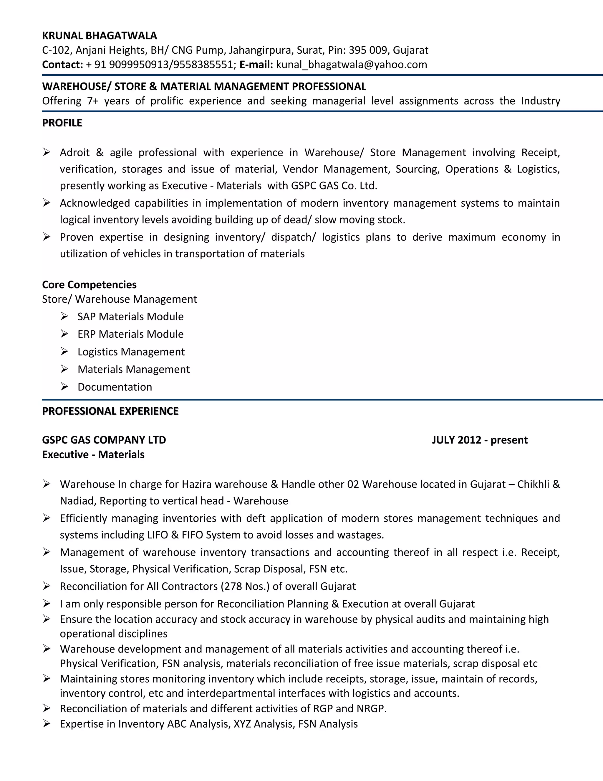 This document contains the resume of Krunal Bhagatwala. He has over 7 years of experience in warehouse and store management. Currently he works as an Executive - Materials for GSPC Gas Company Ltd in Surat, India where he manages their warehouses and inventory. He has expertise in SAP, logistics management, and inventory control techniques. His responsibilities include receiving, storing, and issuing materials, vendor management, and ensuring accurate physical inventories.