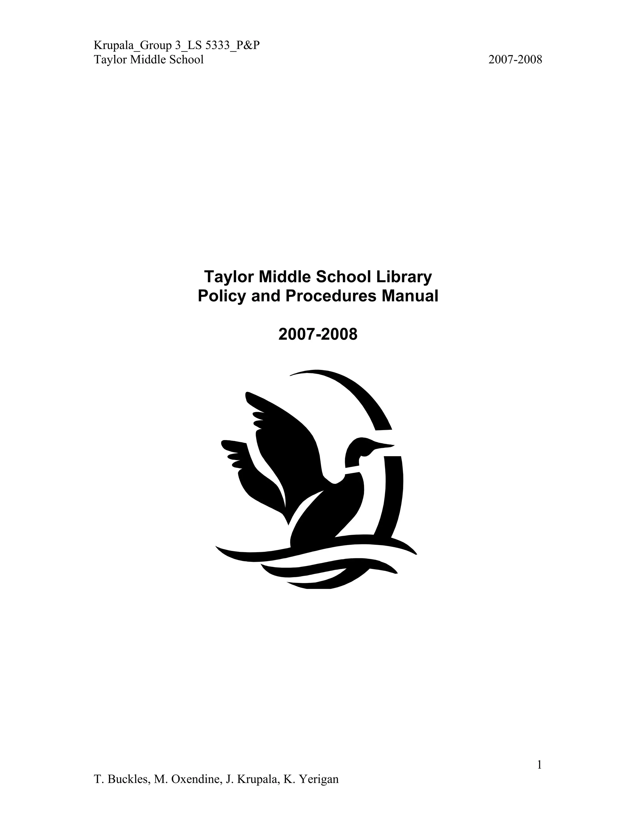 This document outlines the policy and procedures manual for the Taylor Middle School library for the 2007-2008 school year. It includes sections on the mission statement, budget, staffing, facilities, collection development, technology, acquisitions, and program administration. The manual provides guidance for library staff management of the collection and informs the public of the principles used to maintain and use library resources.