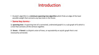 Kruskal's algorithm is a minimum spanning tree algorithm that finds the minimum cost collection of edges that connect all vertices in a connected, undirected graph. It works by sorting the edges by weight and then sequentially adding the shortest edge that does not create a cycle. The algorithm uses a disjoint set data structure to track connected components in the graph. It runs in O(ElogE) time, where E is the number of edges.