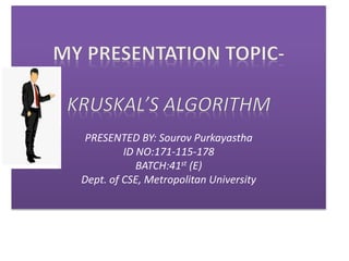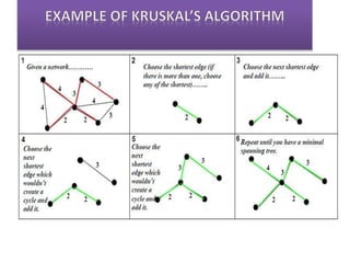 Kruskal's algorithm is a minimum spanning tree algorithm that efficiently finds the least weight edge connecting trees in a forest, with a time complexity of O(e log e). It is capable of creating minimum spanning forests and can be adjusted for adding nodes and edges after the initial solution. The algorithm identifies a subset of edges that connects every vertex with minimal total weight and no cycles.