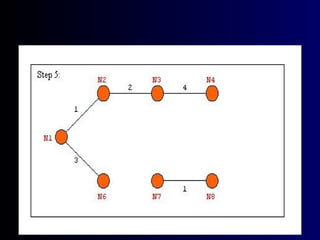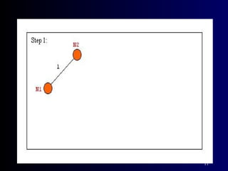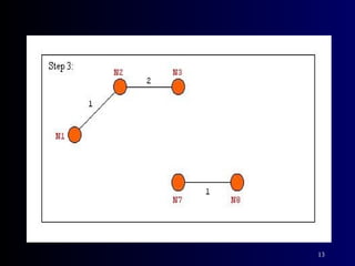 The document summarizes Kruskal's algorithm for finding a minimum cost spanning tree in a graph. Kruskal's algorithm works by sorting the edges by cost and building the spanning tree by adding edges in order of increasing cost, skipping edges that would create cycles. An example graph is provided and the minimum cost spanning tree obtained using Kruskal's algorithm on that graph is shown.