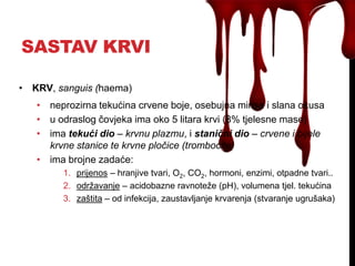 Dokument detaljno objašnjava krvni sustav, uključujući sastav krvi, tipove krvnih stanica (eritrocite, leukocite i trombocite) te procese poput zgrušavanja krvi i zadaće koje krv obavlja. Navodi se značaj eritrocita u prijenosu kisika, važnost bijelih krvnih stanica u obrani organizma, te funkcije trombocita u hemostazi. Također se opisuje sustav krvnih grupa i Rh faktore koji su ključni za sigurne transfuzije krvi.