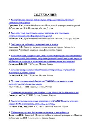 Документ представляет избранные труды международной конференции, посвященной развитию библиотек в современном информационном обществе. Основные темы включают профессиональное развитие библиотекарей, библиотечный маркетинг, использование технологий и методов обслуживания пользователей. Конференция акцентирует внимание на необходимости адаптации библиотечных услуг к современным требованиям и потребностям общества.