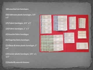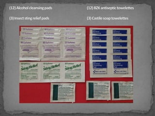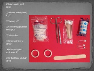 This document provides instructions on treating common injuries and ailments with items found in a first aid kit. It recommends having a first aid manual to instruct on treating wounds, sprains, bites and other issues. The kit should contain tweezers for removing debris from wounds, alcohol swabs for cleaning injuries, antibiotic ointment to aid healing and prevent infection, adhesive bandages in various sizes, gauze pads for absorbing blood or forming bandages, medical tape to secure dressings, elastic bandages to immobilize sprains, pain relievers, and instant cold packs to reduce swelling without refrigeration.