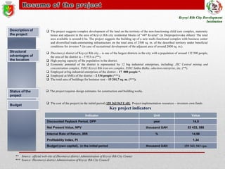 The document proposes developing a multifunctional complex in Kryvyi Rih, Ukraine. The project would redevelop 6 hectares of land containing vacant buildings into a business center with 2500 sqm of commercial space and 2000 sqm of recreational area. It would include a mall, offices, hotel, and restaurant. The estimated budget is 159 million UAH and the internal rate of return is 14.98%. The development aims to meet demand in Kryvyi Rih's population of over 1 million people within a 135km radius.