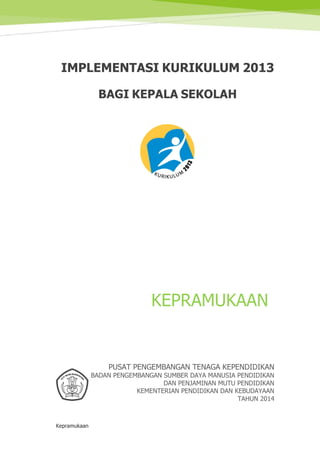 Dokumen ini membahas implementasi kurikulum 2013 untuk kepala sekolah dan pengawas sekolah, menekankan pentingnya peningkatan kompetensi melalui pelatihan yang terukur dan sistematis. Materi pelatihan mencakup manajemen, supervisi akademik, dan kepramukaan, bertujuan untuk memastikan efektivitas pelaksanaan kurikulum. Kegiatan ekstrakurikuler pramuka dijelaskan sebagai bagian wajib dalam kurikulum yang mendukung pengembangan karakter siswa.