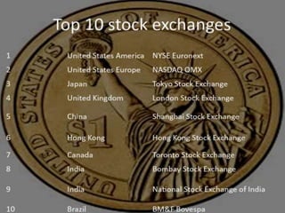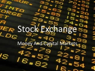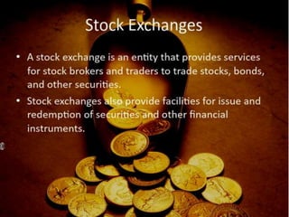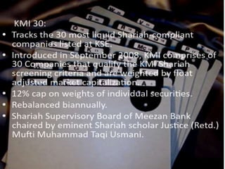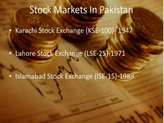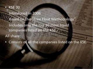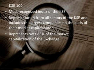 The document provides information about stock exchanges and indexes in Pakistan. It discusses the history of stock exchanges dating back to the 12th century in France. It then covers the purpose and role of stock exchanges, including raising capital for businesses and creating investment opportunities. The document outlines the vision, mission and various indexes of the Karachi Stock Exchange, including the KSE 100, KSE 30 and KMI 30 indexes. It provides details on how the KSE 100, KSE 30 and KMI 30 indexes are calculated based on factors like market capitalization and dividends of the companies that make up each index.