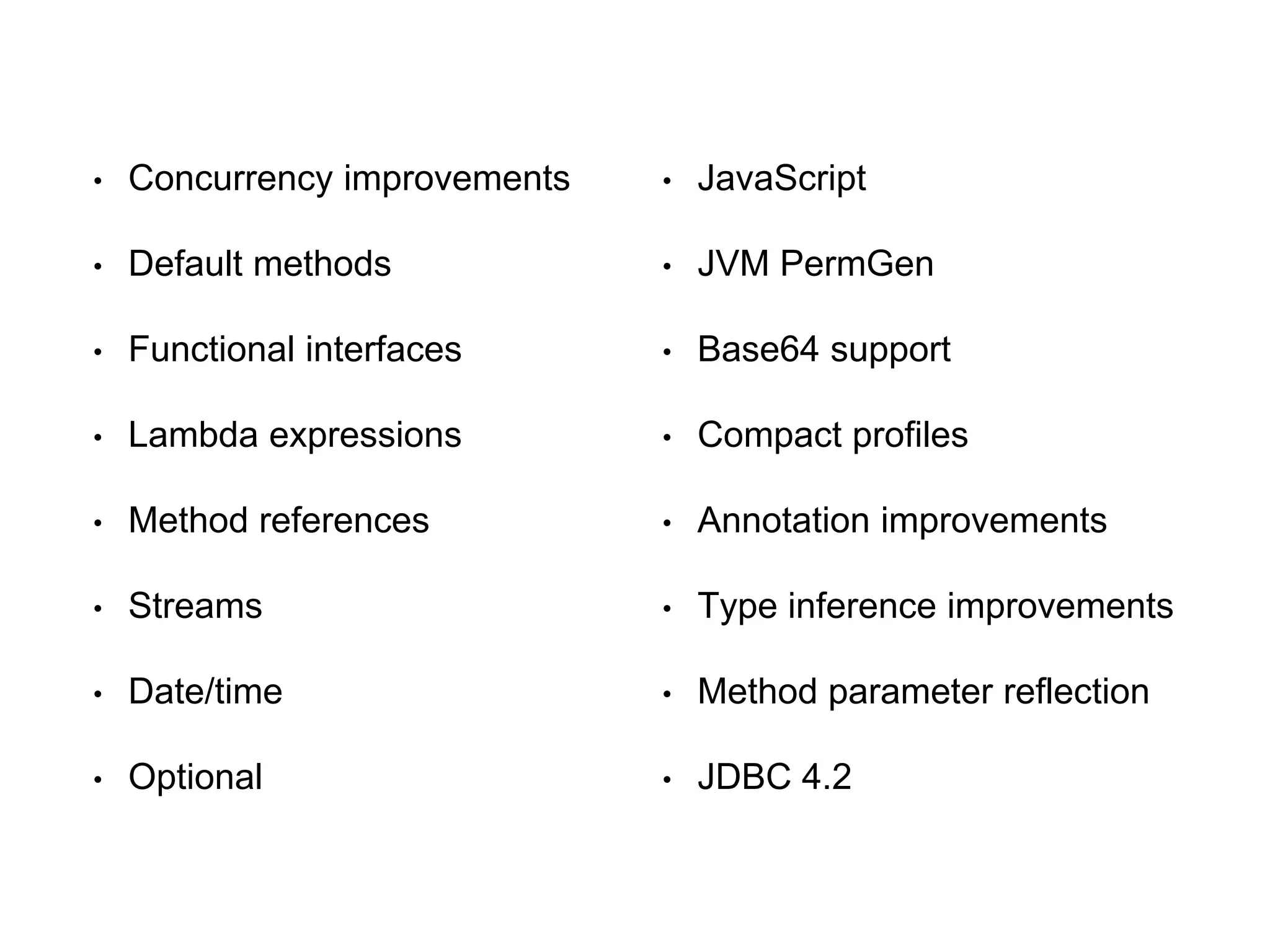 The document discusses the new features in Java 8, including improvements in concurrency with new classes like LongAdder and StampedLock, support for functional programming through default methods, functional interfaces, and lambda expressions, as well as the introduction of streams for processing collections. It also highlights the enhancements in date/time handling and optional types. The document concludes with information on downloading JDK 8 and IDE support for it.