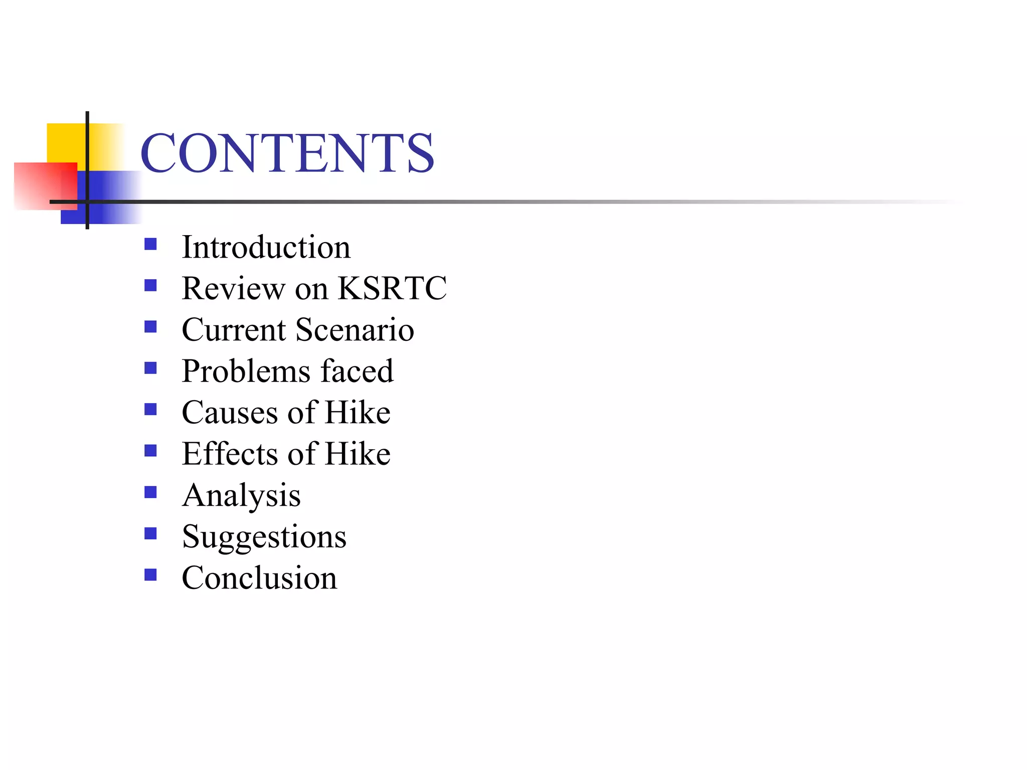 The document discusses the recent fare hike by KSRTC, the state-run bus service in Kerala. It provides background on KSRTC and reviews the current scenario. The hike was necessary due to rising operational costs from increased fuel prices. However, KSRTC faces problems like an aging fleet, high staff ratios, and competition from private operators. Suggestions are made to nationalize more routes, improve management techniques, and maintain support from the government and public.
