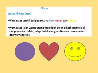 Dokumen ini membahas berbagai teknik seni seperti menggambar, membuat montaj, dan origami, serta menjelaskan rupa positif dan negatif. Terdapat juga penjelasan mengenai kraf tradisional yang meliputi alat dan motif dalam penghasilannya. Berbagai teknik dan jenis garis dalam seni juga dicakup, memberikan gambaran menyeluruh tentang aktiviti seni dan kraf.