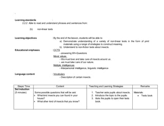 The English lesson plan is for Year 4 students on Tuesday from 10:45-11:15 AM. The lesson will focus on reading about insects with an integrated writing skill. Students will learn to understand non-linear texts about insects and answer questions. A video on ants will be shown and students will complete a worksheet to assess their understanding. The lesson aims to teach students to care for insects in nature.