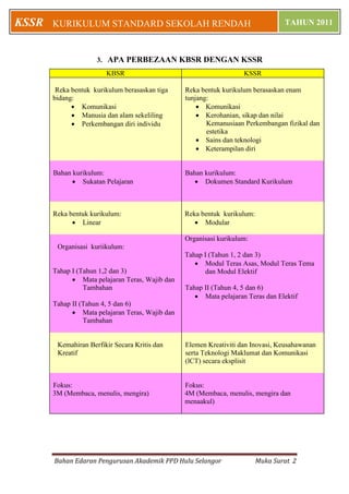 Kurikulum Standard Sekolah Rendah (KSSR) diperkenalkan sebagai transformasi terhadap Kurikulum Bersepadu Sekolah Rendah (KBSR) untuk membekalkan murid dengan pengetahuan, kemahiran, dan nilai yang relevan dengan keperluan abad ke-21. KSSS menekankan pengajaran interaktif, pendidikan khas, serta pengintegrasian elemen kreatif dan inovasi bagi meningkatkan kualiti pendidikan murid. Selain itu, guru-guru dilatih untuk melaksanakan KSSR dalam usaha memastikan sistem pendidikan selaras dengan standard global.