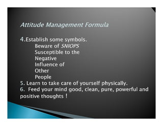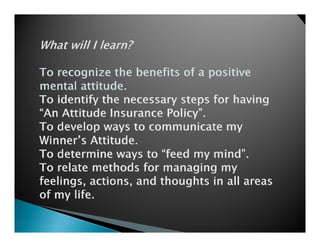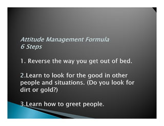 This document provides an overview of success and effective communication. It begins with an exercise to identify qualities of successful people and which qualities you possess. It then discusses developing attitudes like honesty and skills like goal-setting that can lead to success. The document also covers models for effective communication, including understanding your audience and goal. It provides tips for assertive communication and avoiding passive or aggressive behaviors.