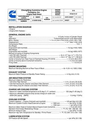 The document provides detailed specifications for the Chongqing Cummins D19 Series diesel engine, including its dimensions, weights, performance data, and system characteristics. It covers aspects such as power output at different RPMs, fuel and lubrication systems, and operational parameters like temperature and pressure limits. This comprehensive data sheet is essential for understanding the engine's capabilities and requirements for installation and operation.