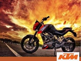 KTM was founded in 1934 in Austria as a metal workshop and began motorcycle manufacturing. Key milestones include starting serial production of the R100 in 1954 and launching their first moped, the Mecky, in 1957. In 2013, Bajaj Auto acquired a 48% stake in KTM, allowing KTM to launch their first bikes in India in 2012, including the popular Duke 200 and Duke 390 models. Currently KTM's top models in India are the Duke 390, Duke 250 and Duke 200 and they continue developing new motorcycle and vehicle models.