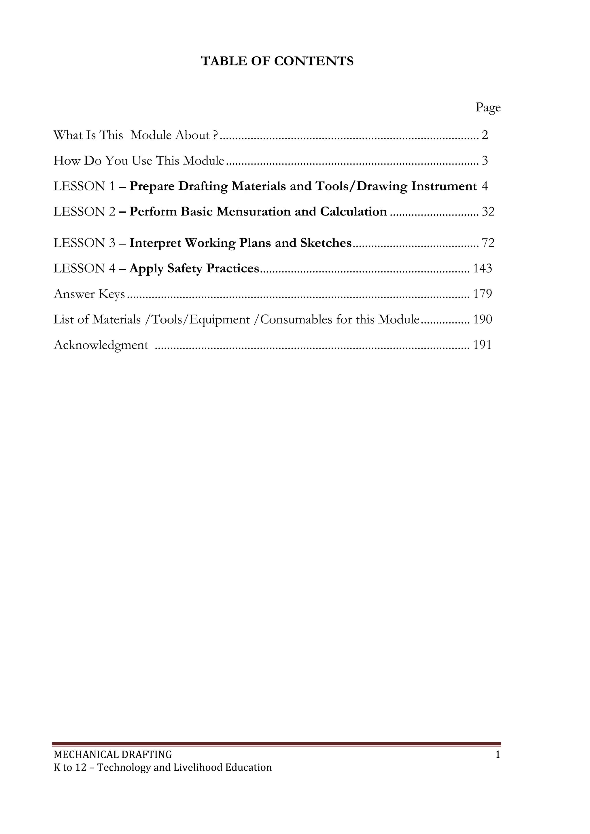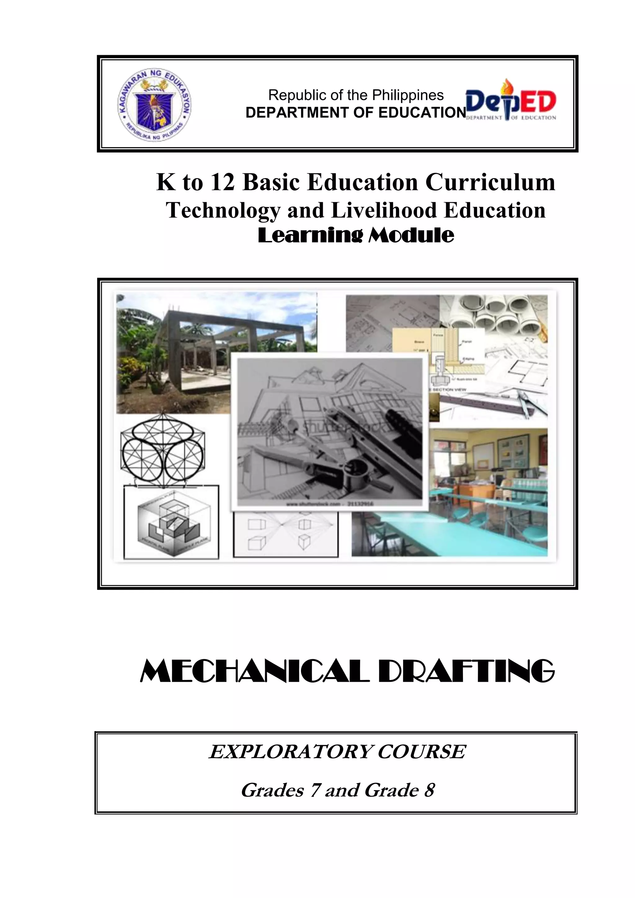 This document provides information about drafting materials and tools/drawing instruments that are used in mechanical drafting. It contains 4 lessons that cover identifying drafting materials and tools for specific jobs, performing basic mensuration and calculations, interpreting working plans and sketches, and applying safety practices.