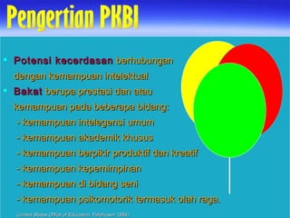 Dokumen ini membahas pengembangan Kurikulum Tingkat Satuan Pendidikan (KTSP) untuk Peserta Didik Cerdas Istimewa (PDCI) di sekolah PKBI. Dokumen menjelaskan prinsip-prinsip pengembangan KTSP yang berfokus pada potensi dan kebutuhan PDCI serta lingkungannya, serta mengembangkan kurikulum secara berdiferensiasi melalui materi, proses, produk, dan lingkungan belajar.